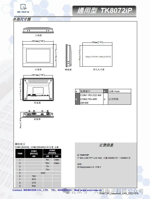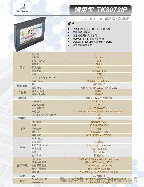 威綸通觸摸屏TK8072IP選型資料、開孔尺寸支持以太網7寸